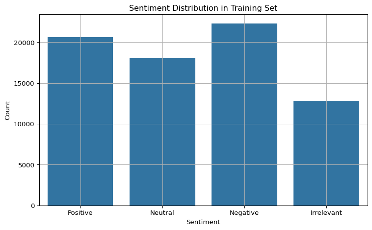 import seaborn as snsimport matplotlib.pyplot as pltplt.figure(figsize=(8, 5))sns.countplot(data=train, x="sentiment")plt.title("Sentiment Distribution in Training Set")plt.xlabel("Sentiment")plt.ylabel("Count")plt.grid(True)plt.tight_layout()plt.show()
