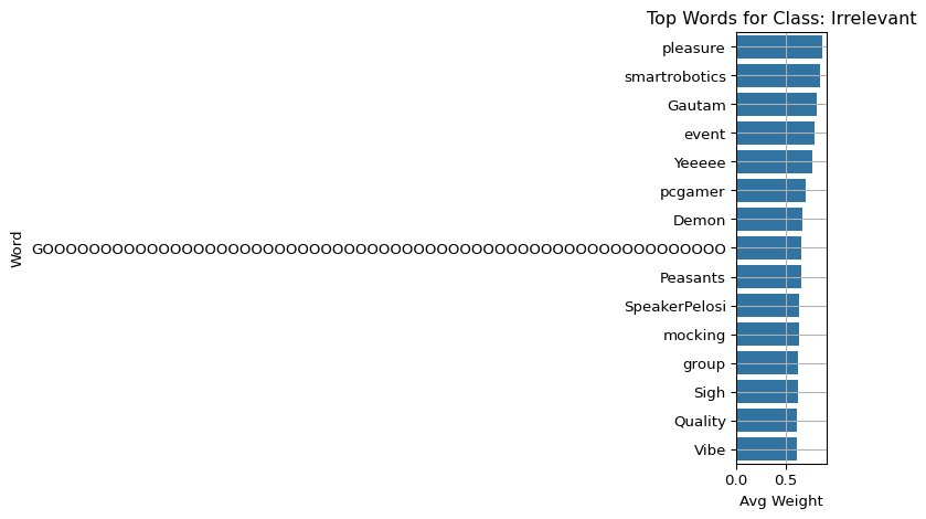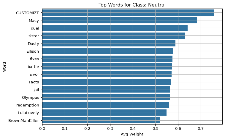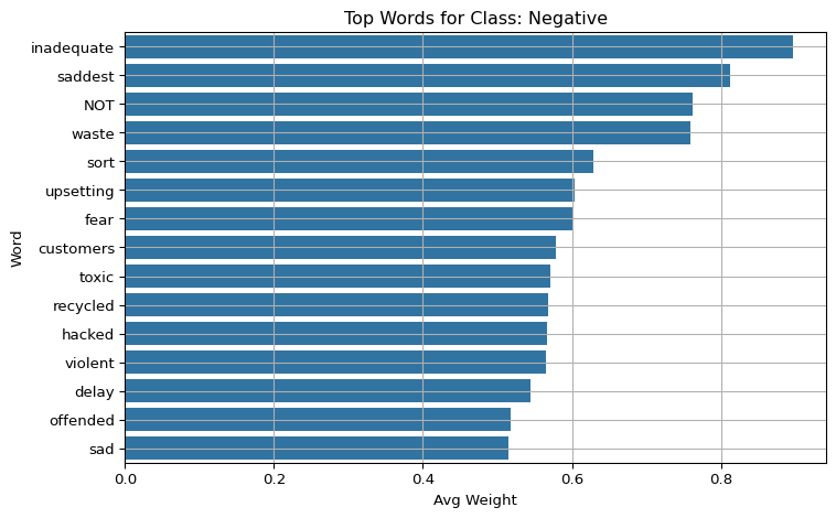 import matplotlib.pyplot as pltimport seaborn as snsfor label in class_names: subset = df_weights[df_weights["pred_label"] == label] top_words = subset.groupby("word")["weight"].mean().sort_values(ascending=False).head(15) plt.figure(figsize=(8, 5)) sns.barplot(y=top_words.index, x=top_words.values) plt.title(f"Top Words for Class: {label}") plt.xlabel("Avg Weight") plt.ylabel("Word") plt.grid(True) plt.tight_layout() plt.show()