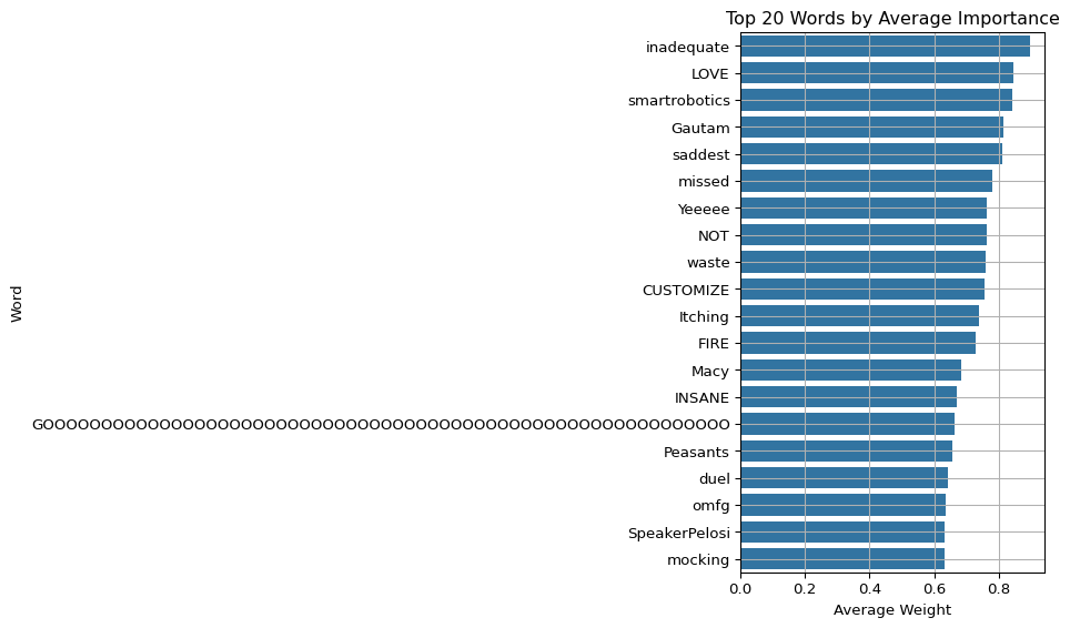 import matplotlib.pyplot as pltimport seaborn as sns# Top contributing wordstop_words = df_weights.groupby("word")["weight"].mean().sort_values(ascending=False).head(20)plt.figure(figsize=(10,6))sns.barplot(y=top_words.index, x=top_words.values)plt.title("Top 20 Words by Average Importance")plt.xlabel("Average Weight")plt.ylabel("Word")plt.grid(True)plt.tight_layout()plt.show()