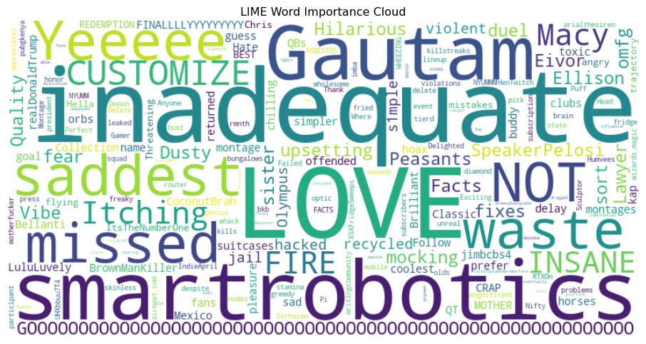 from wordcloud import WordCloudword_freq = df_weights.groupby("word")["weight"].mean().to_dict()wordcloud = WordCloud(width=800, height=400, background_color="white").generate_from_frequencies(word_freq)plt.figure(figsize=(12, 6))plt.imshow(wordcloud, interpolation="bilinear")plt.axis("off")plt.title("LIME Word Importance Cloud")plt.show()