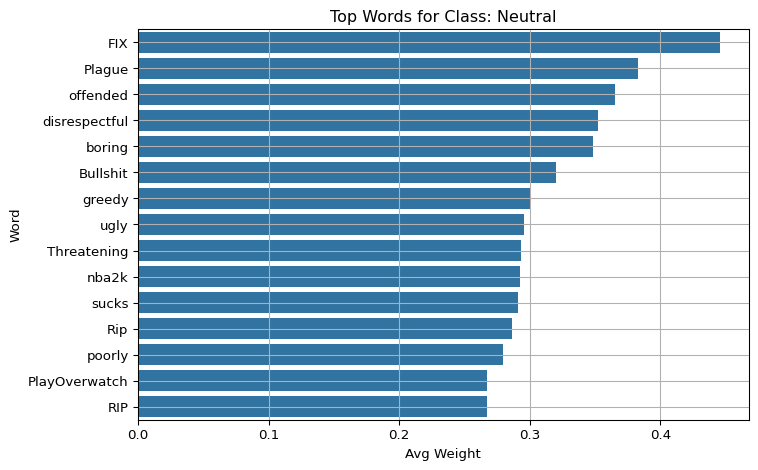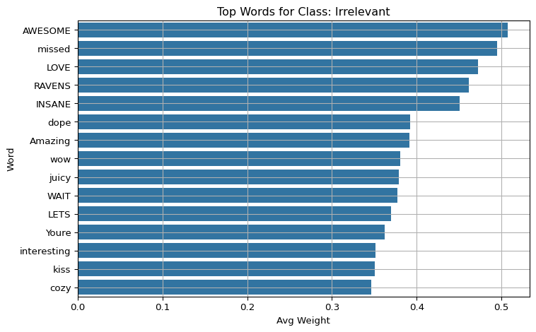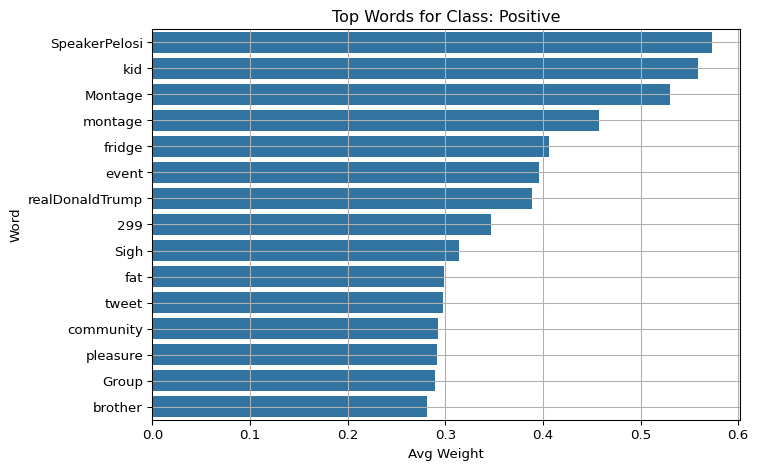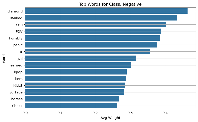 import matplotlib.pyplot as pltimport seaborn as snsfor label in class_names: subset = df_weights[df_weights["pred_label"] == label] top_words = subset.groupby("word")["weight"].mean().sort_values(ascending=False).head(15) plt.figure(figsize=(8, 5)) sns.barplot(y=top_words.index, x=top_words.values) plt.title(f"Top Words for Class: {label}") plt.xlabel("Avg Weight") plt.ylabel("Word") plt.grid(True) plt.tight_layout() plt.show()
