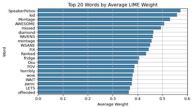 top_words = df_weights.groupby("word")["weight"].mean().sort_values(ascending=False).head(20)plt.figure(figsize=(7, 4))sns.barplot(y=top_words.index, x=top_words.values)plt.title("Top 20 Words by Average LIME Weight")plt.xlabel("Average Weight")plt.ylabel("Word")plt.grid(True)plt.tight_layout()plt.show()