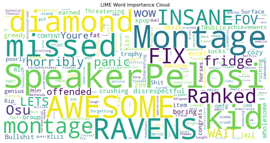 from wordcloud import WordCloudword_freq = df_weights.groupby("word")["weight"].mean().to_dict()wordcloud = WordCloud(width=800, height=400, background_color="white").generate_from_frequencies(word_freq)plt.figure(figsize=(12, 6))plt.imshow(wordcloud, interpolation="bilinear")plt.axis("off")plt.title("LIME Word Importance Cloud")plt.show()