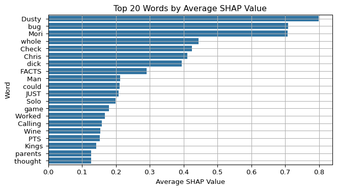 import matplotlib.pyplot as pltimport seaborn as snsdf_shap_clean = df_shap[df_shap["word"].str.len() >3]df_shap_clean = df_shap_clean[df_shap_clean["word"].str[0].str.isalpha()]top_words = df_shap_clean.groupby("word")["shap_value"].mean().sort_values(ascending=False).head(20)plt.figure(figsize=(7,4))sns.barplot(y=top_words.index, x=top_words.values)plt.title("Top 20 Words by Average SHAP Value")plt.xlabel("Average SHAP Value")plt.ylabel("Word")plt.grid(True)plt.tight_layout()plt.show()
