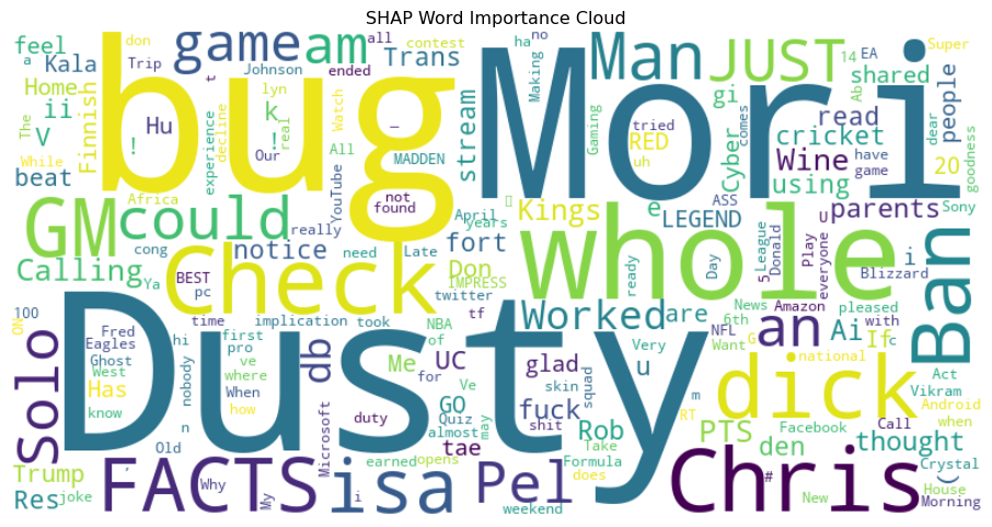 import emojiimport pandas as pddef clean_text(text): no_emoji = emoji.replace_emoji(text, replace='') cleaned = no_emoji.encode("utf-8", "ignore").decode("utf-8", "ignore")return cleanedall_shap = []#print("Running SHAP on validation samples...")for idx, row in val.iterrows(): text = clean_text(str(row["tweet"])) sentiment = row["sentiment"]#print(f"Explaining tweet {idx+1}: {text[:50]}...") shap_values = explainer([text]) pred_label = class_names[np.argmax(shap_values.values[0].sum(axis=0))]for word, value inzip(shap_values.data[0], shap_values.values[0][np.argmax(shap_values.values[0].sum(axis=0))]): all_shap.append({"tweet": text,"true_label": sentiment,"pred_label": pred_label,"word": word,"shap_value": value })df_shap = pd.DataFrame(all_shap)#print("SHAP explanations complete.")